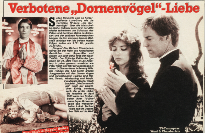 The Thorn Birds Forbidden Love Rarely can we see such a heart-seizing Love Story like The Thorn Birds series. Since 4 October, on ARD, you can again watch the fate of the cardinal Ralph de Bricassart and the beautiful farmer's daughter, Meggie, who has loved him since she was a small girl (the last two episodes will be shown on the October 9/11.10, in each case at 20,15 o'clock). Thanks to the role of the catholic clergyman, Shogun star Richard Chamberlain became a superstar and received the Golden Otto from you in 1985. The 52-year-old Californian (born on 31 March 1935 in Los Angeles) is privately just as unattainable as father Ralph, and lives alone in a three-room house in Beverly Hills. The hobbies of the 1.83 meters large bachelor's with blue eyes and dark-blond hair are riding, tennis, windsurfing and music. For Meggie (Rachel Ward) The Thorn Birds brought not only a worldwide popularity, but also great love. In April 1983, after finishing her work, she married her TV-married man Bryan Brown (who plays the migratory worker hatch). In December 1984, their daughter Rosie was born. (source: Bravo, 1987) |