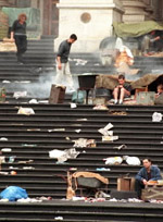 During the making of the 1959 film On the Beach, a similar sign was strewn across the front of the State Library (being a Salvation Army sign, it read: "There is still time ... brother"). It overlooked the shanty town that formed on the forecourt steps below, the final destination for thousands of northerners fleeing the quickly approaching radiation cloud that was engulfing the globe after a nuclear holocaust in the northern hemisphere. |